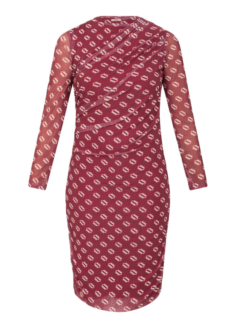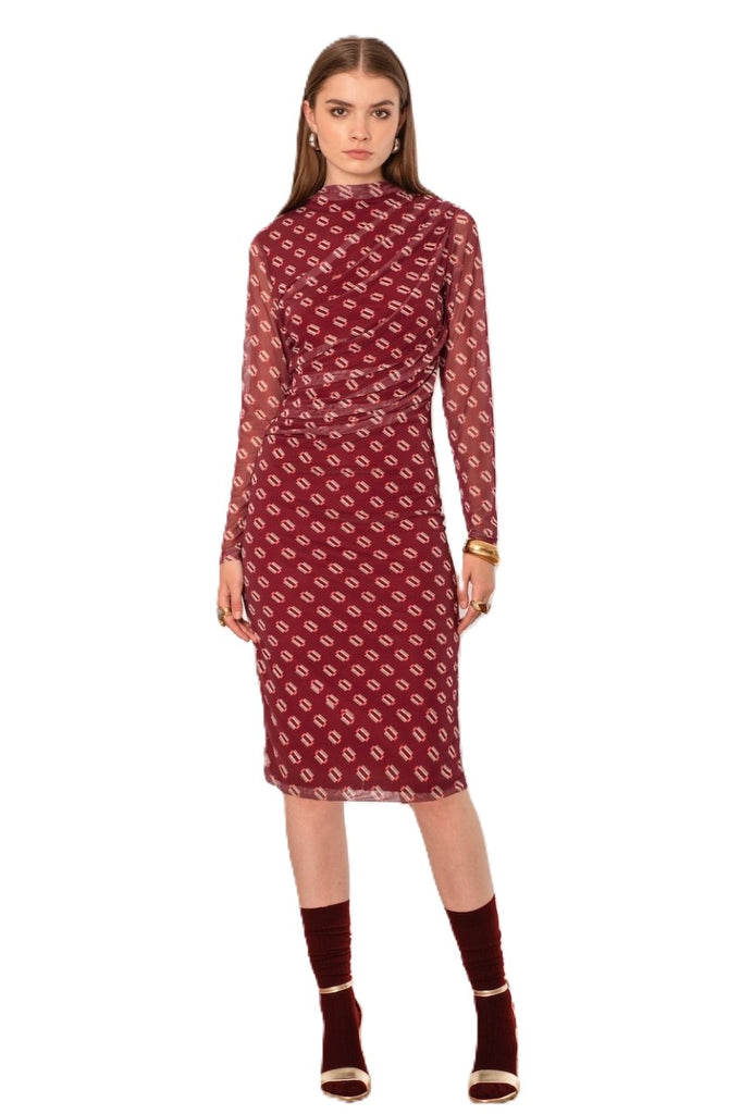 NO-NA' Abito a tubino midi in tulle stretch con drappeggi e logo