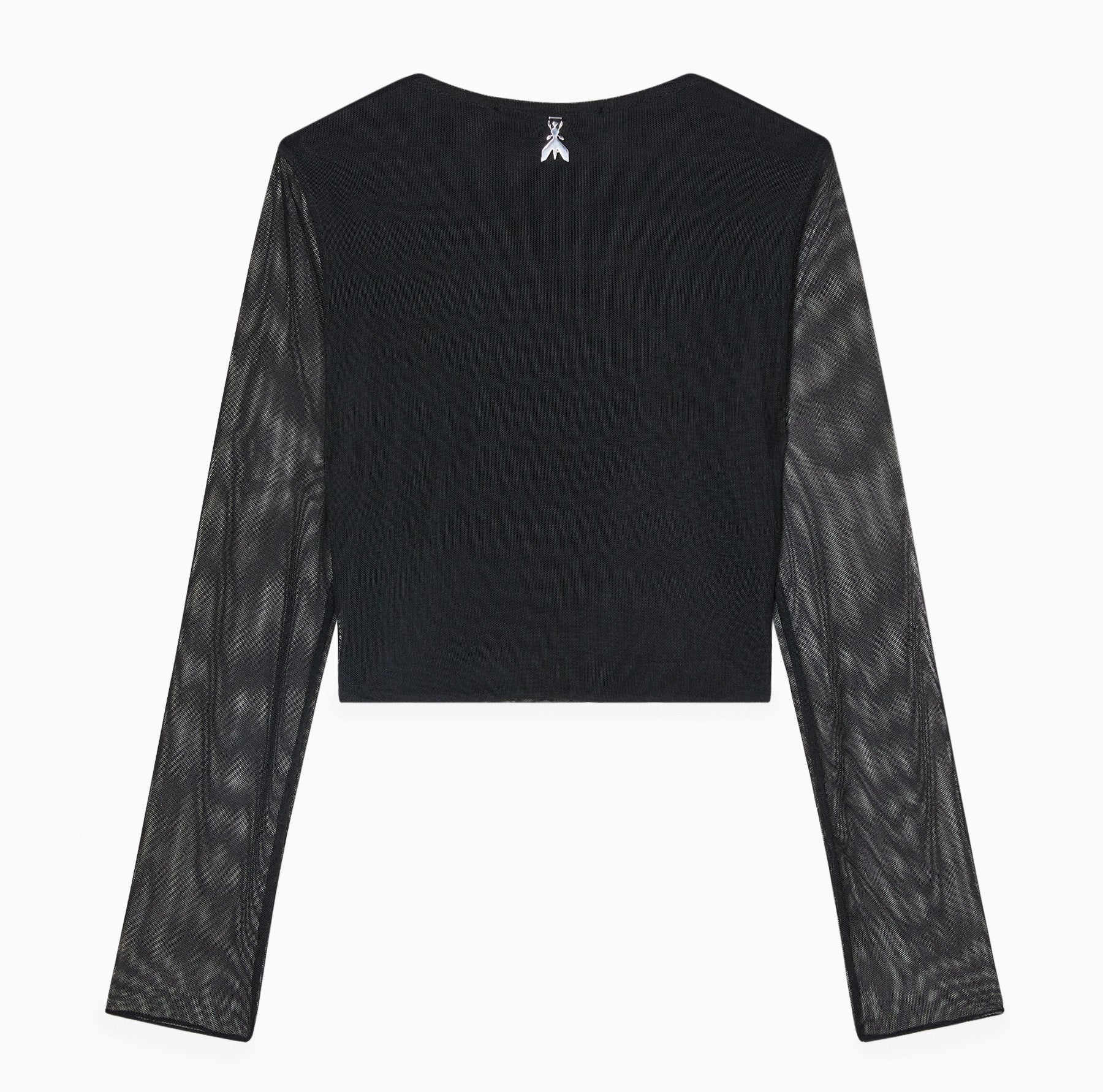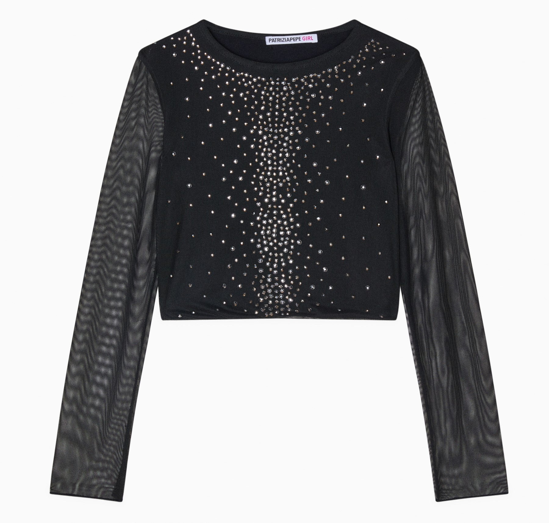 PATRIZIA PEPE T-shirt cropped in tulle stretch con strass e logo